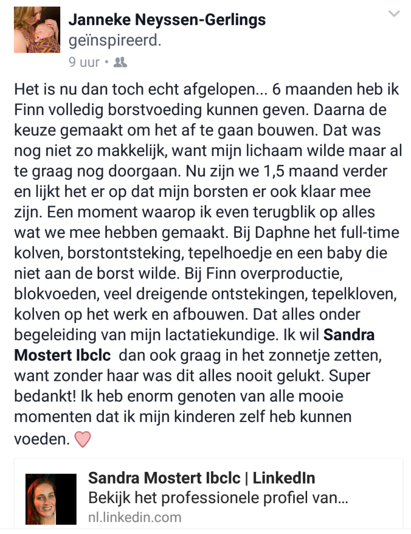 Lieve Sandra, je was mijn laatste hoop om onze kleine meid nog aan de borst te krijgen. Met jouw hulp wilde ik het nog één kans geven. Wat ben ik blij dat ik dit heb gedaan. Geen tepelhoedjes meer, een relaxte baby ( op een paar pittige momentjes na ;-)) en mij als blije mama dat het gelukt is. Het is nog oefenen maar ik heb er vertrouwen in. Jouw tips, geduld en vertrouwen zijn top! Ben je zo dankbaar! Tot gauw.